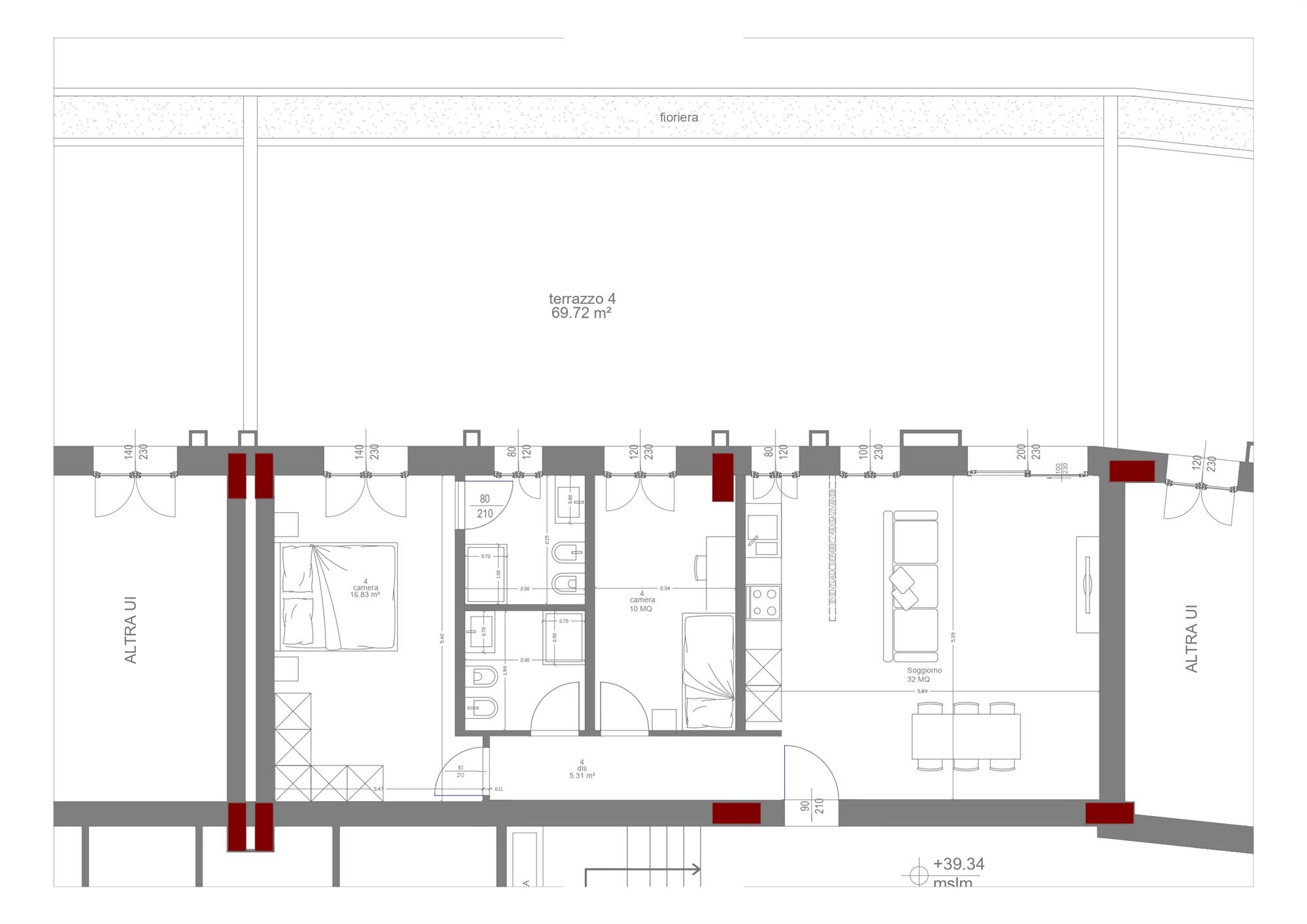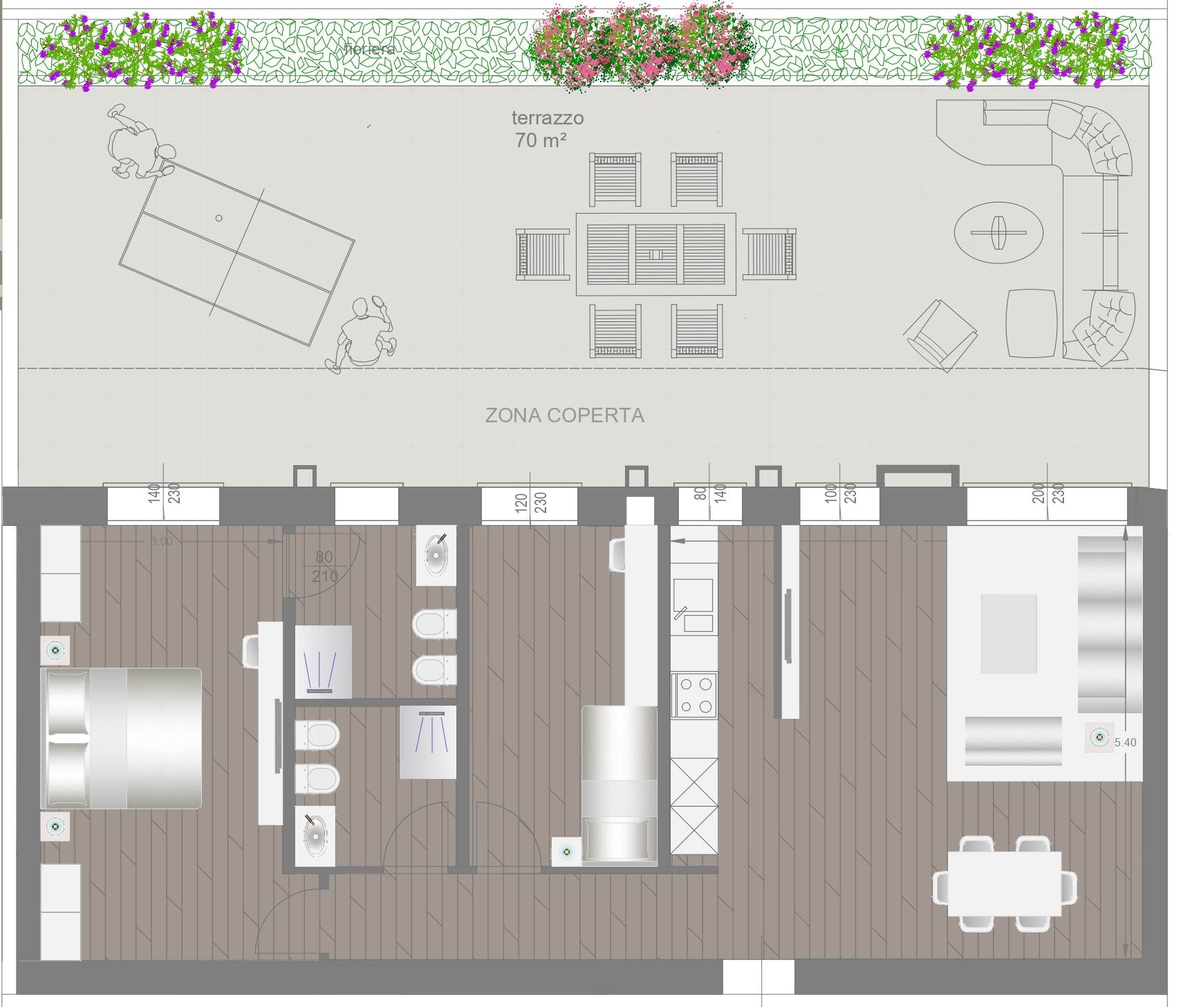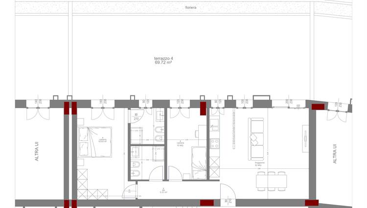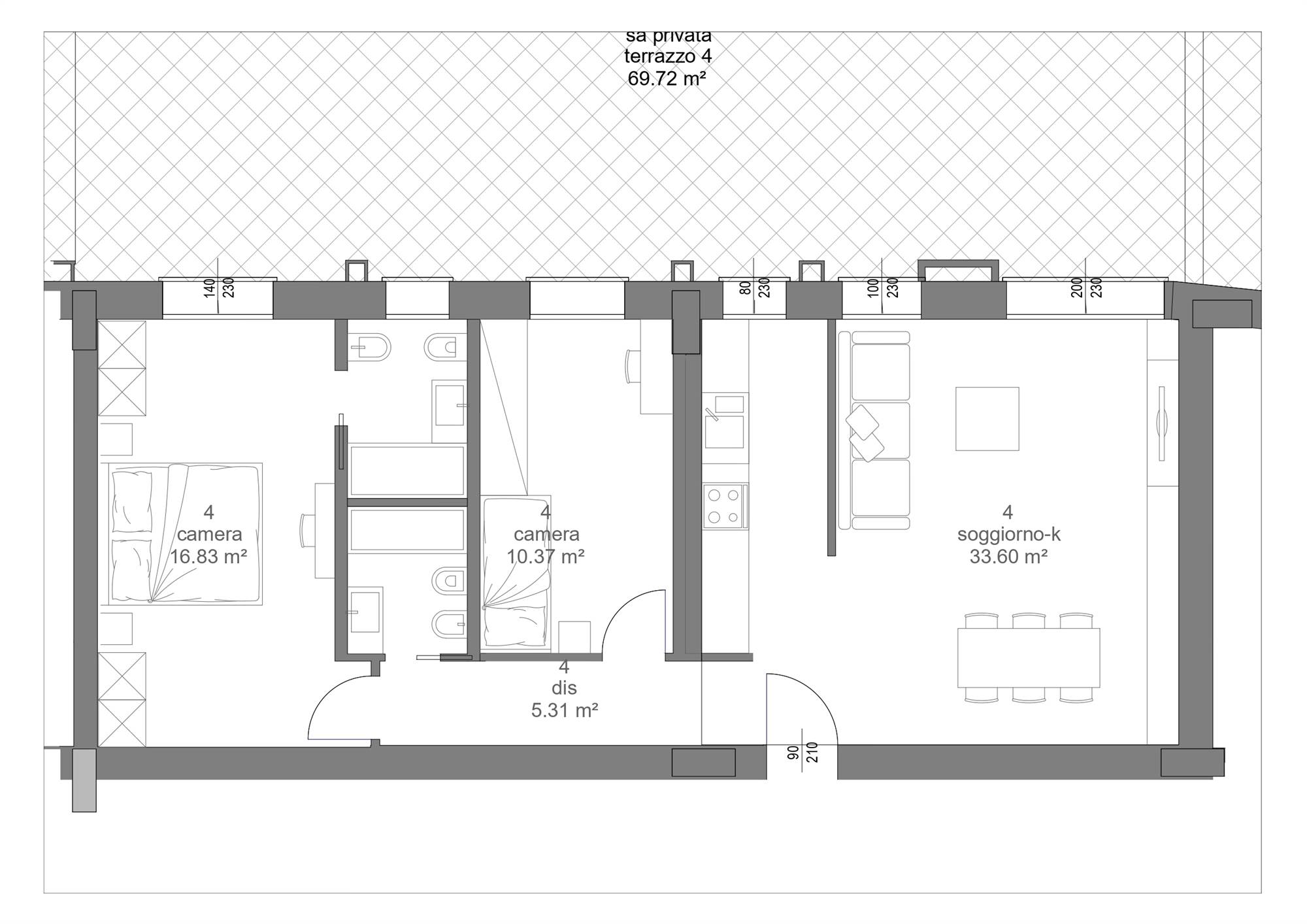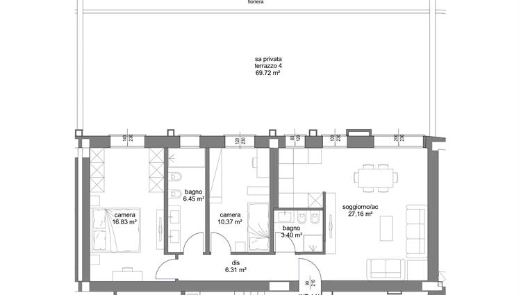 COMPOSIZIONE: Sito al piano rialzato, composto da ampio soggiorno con angolo cottura, 2 camere (1 matrimoniale, 1 singola) 2 bagni completi ed entrambi finestrati, grande terrazzo di oltre 80 mq esposto a Sud/Ovest e cantina al piano. Possibilità di acquistare un' autorimessa con prezzo a parte.