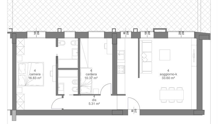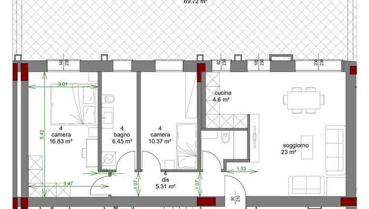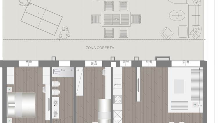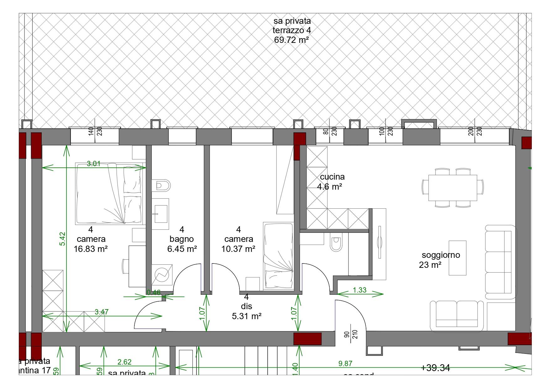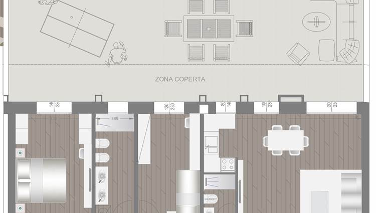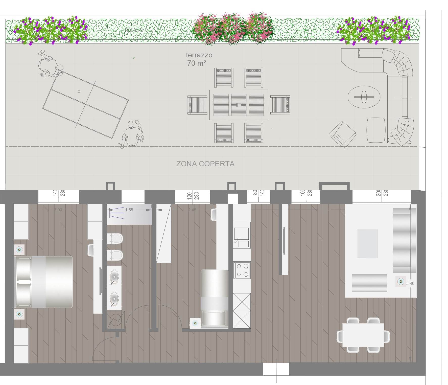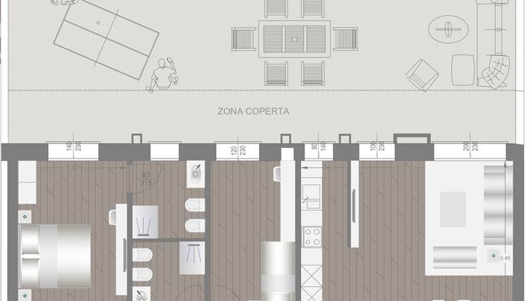 COMPOSIZIONE: Sito al piano rialzato, composto da ampio soggiorno con angolo cottura, 2 camere (1 matrimoniale, 1 singola) 2 bagni completi ed entrambi finestrati, grande terrazzo di oltre 80 mq esposto a Sud/Ovest e cantina al piano. Possibilità di acquistare un' autorimessa con prezzo a parte.